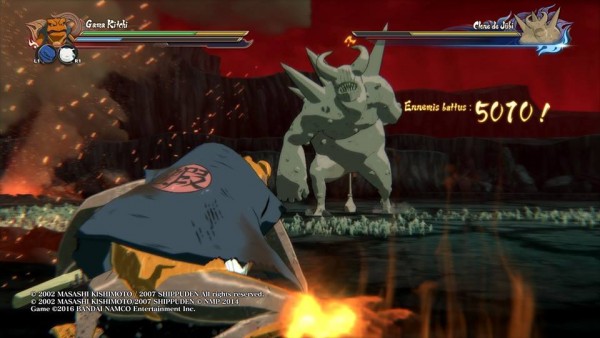 Des combats mythiques, vous allez en voir un paquet car le jeu va reprendre les combats marquants qui ont été évoqués précédemment comme par exemple l’arc Kakashi Gaiden qui a été travaillé dans sa longueur avec ce qui entraina la « mort » d’Obito, mais aussi ce qui lui est arrivé ensuite avec son entrainement face aux White-Zetsu et surtout le moment où il « perd le contrôle » en voyant la mort de Rin et où vous éliminerez d’une seule attaque des ninjas des forces spéciales de leur village. Vous allez aussi avoir droit à des combats imaginaires, par exemple, Sasuke va se battre contre Orochimaru après avoir vaincu Kabuto/Orochimaru, puis il combattra contre les 3 premiers Hokage en même temps. De plus, il vous offre la possibilité d’incarner différents personnages (autres que les ninjas), en plus de Kyubi, vous pourrez devenir Hachibi ou Gamakichi dans un combat en 1 vs 1 où dans d’autres phases de jeu durant lesquelles vous devrez fuir ou au contraire aller au contact de votre ennemi.Le mode histoire est un des points forts du jeu, surtout qu’il permet de suivre deux histoires séparées jusqu’à leur point de rencontre, c’est-à-dire suivre Naruto et ses amis, ou Sasuke et Taka, sa bande de Badboy jusqu’à la réunion de l’équipe 7.